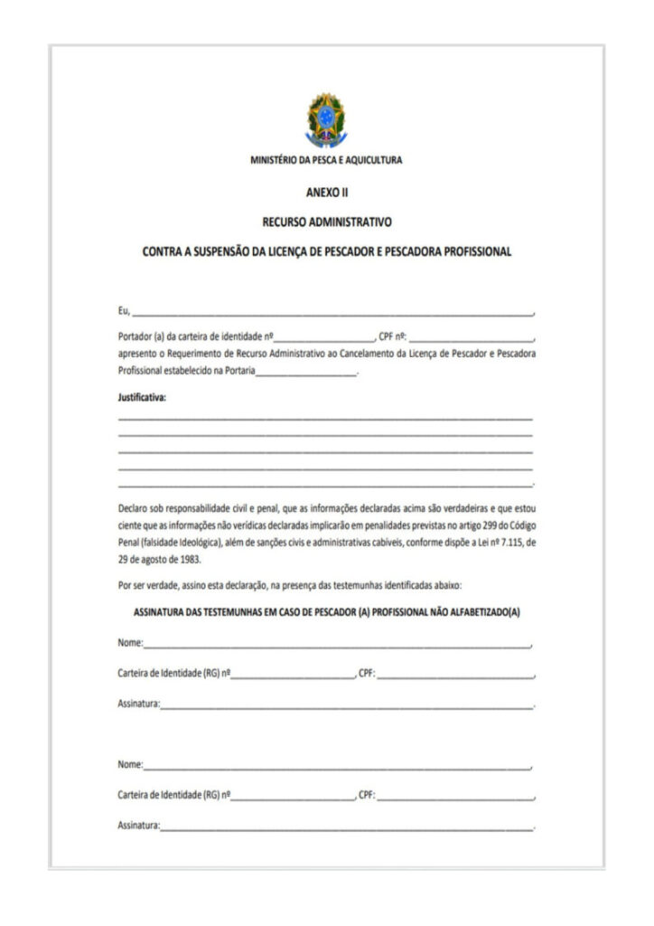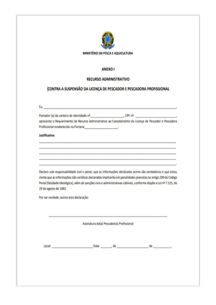 Art. 2º Os Pescadores e Pescadoras Profissionais que tiverem suas licenças suspensas poderão interpor recurso administrativo no prazo de até trinta dias corridos, contados da data de entrada em vigor desta Portaria, nos termos do art. 25, parágrafo único, da Portaria nº 127, de 29 de agosto de 2023, do Ministério da Pesca e Aquicultura.